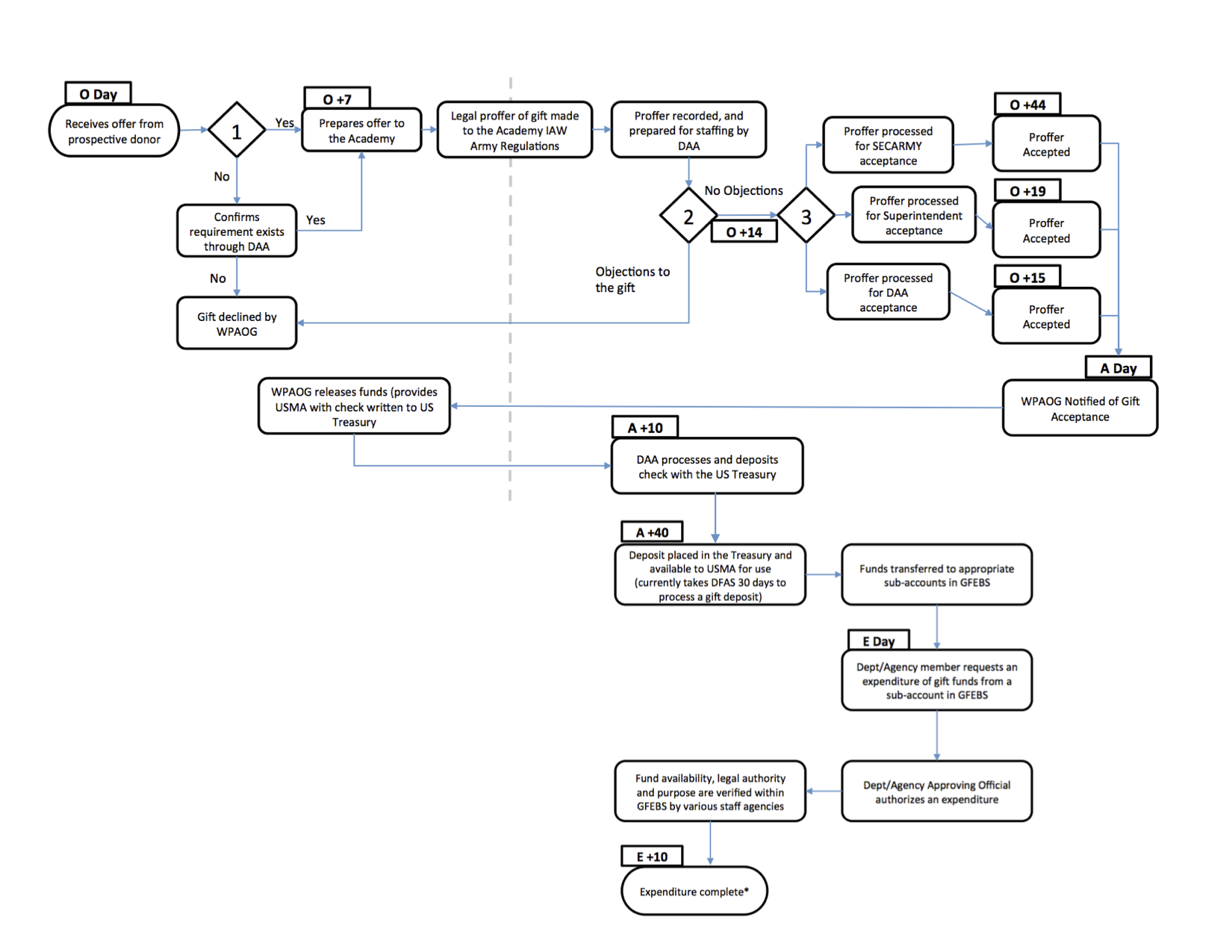 In the diagram below: DAA = Directorate of Academy Advancement, O = Offer Day, and A = Acceptance Day (act of acceptance - this has nothing to do with Plebes!), E = Request for Expenditure Day, DFAS = Defense Finance and Accounting Service, and GFEBS = General Fund Enterprise Business System (GFEBS).